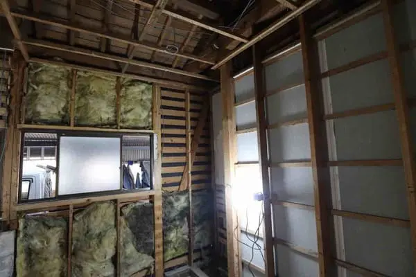 室内では、古い壁材を取り外し、柱や胴縁などの骨組みが見える状態に。