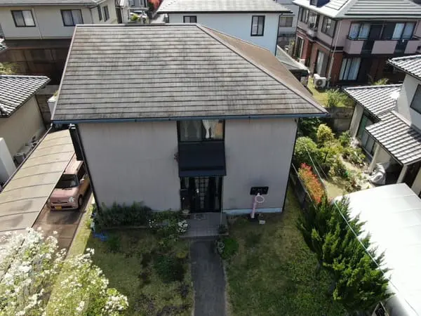 ただし、屋根材の表面には色あせや細かな汚れが見られ、長年の紫外線や雨の影響による劣化が進んでいる様子が確認できます。