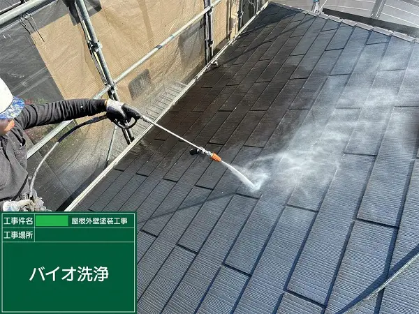 塗装工事では水だけで汚れを落とす高圧洗浄をする業者が多いですが、当社ではよくバイオ洗浄を提案します。
