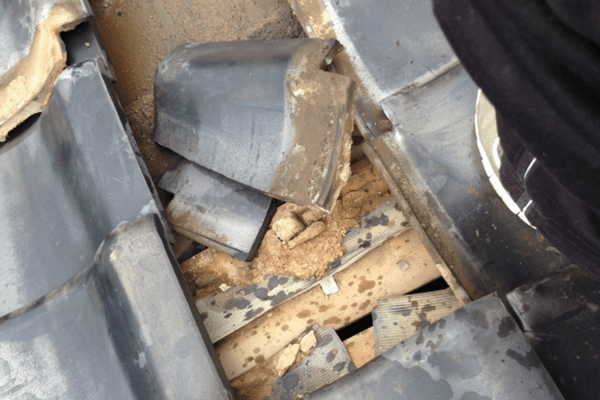瓦の剥がれや割れ、お庭に瓦の欠片が落ちているといった症状は、短期間で雨漏りに至ることがありますので、お早めに専門業者にお問い合わせください。台風後などは特に要注意です。